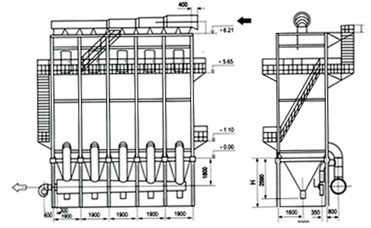(1) 過濾:含塵煙氣經煙氣經煙道進(jìn)入進氣管,由上站進入(rù)進氣室,部分粗粒由慣性(xìng)而落入灰鬥(dòu),其餘部分煙(yān)氣粉塵進入(rù)濾袋,經內表麵過濾後,進入袋室,然後經(jīng)由通風槽、排氣閥、出氣管道由排風機排入(rù)大氣,該設(shè)備為上部進氣,負壓振作風(fēng)濾式玻纖袋(dài)除塵器。