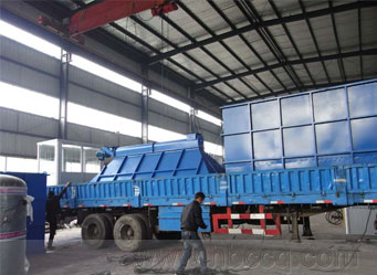 浙江寧波北倫電(diàn)廠粉(fěn)煤灰處理用PPC96-8布袋除塵器(qì)運抵現場,正在卸車。