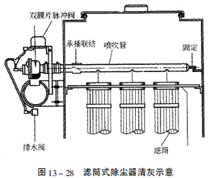 濾芯式除塵設備的清灰示(shì)意見圖(tú)13—28,濾芯式除塵設(shè)備特別適合(hé)安裝在室內生(shēng)產線中,或者作(zuò)為移動式除塵(chén)設備應(yīng)用。由於需要(yào)特殊加(jiā)工,折疊式濾芯每平方的濾料麵積相對比濾袋大,而且濾芯的清灰係統要求比較高,風速一般在0.8m/min以下,比濾袋低(dī),所以濾芯(xīn)式除(chú)塵設備的造價也就(jiù)比袋式除塵設備稍高(gāo)。
