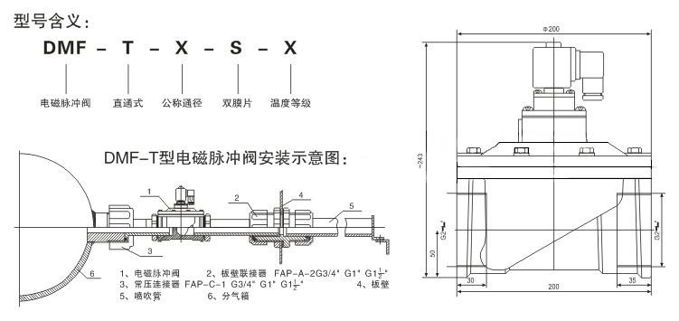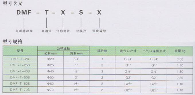 DMF-T型電磁脈衝閥為(wéi)直通閥,其進氣口之間夾角為180°(進出口中(zhōng)心線為同一直線),其進口與儲(chǔ)氣筒連(lián)接,出口(kǒu)與(yǔ)噴吹管(guǎn)連接。氣流暢通,能提(tí)供符(fú)合(hé)要(yào)求的清灰氣脈衝。
