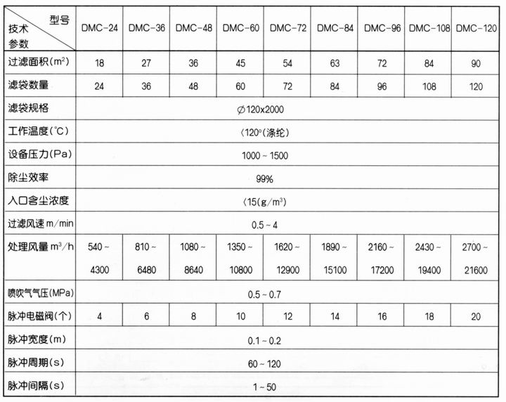 DMC型脈(mò)衝袋式倉頂除塵器 DMC型脈(mò)衝袋式倉頂除塵器適宜布置在各種粉料貯存庫的頂部,用於捕集各種細小幹燥非纖維粉塵。 主(zhǔ)要技術參數: DMC型脈衝袋式倉頂除塵器主要技(jì)術參(cān)數見表,在選型時應注意入(rù)口粉塵濃度,在技術性能上,透過濾袋的氣流速度(即過濾風