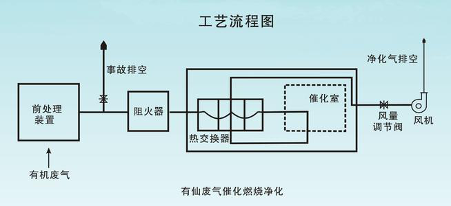 本(běn)裝置是利用催化劑做中(zhōng)間體,使有機氣(qì)體(tǐ)在較低的溫度下燃燒、生成無害(hài)的二氧化碳和水蒸氣排放。反應方程式: