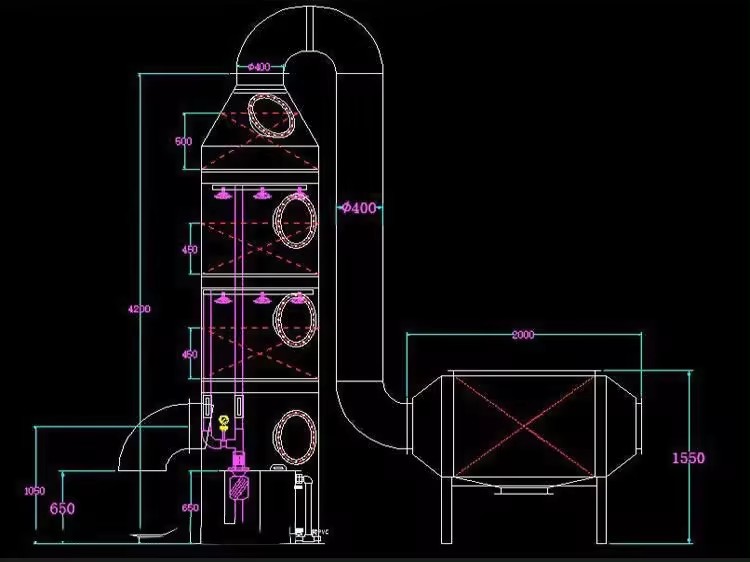 廢氣由風機引入噴淋塔,內筒形成壓力室,壓力室(shì)均勻(yún)分布到每(měi)個鼓泡管。廢氣通過鼓(gǔ)泡管(guǎn),進入液體吸收罐吸收鼓泡液體,然後氣泡通過填料(liào)層。氣(qì)-液兩相與吸收中和反(fǎn)應(yīng)完全接觸(chù)。水經塔底的水泵加壓後噴(pēn)在塔頂,最後返回塔底回收,並且吸收和過濾後的廢氣(qì)繼(jì)續向上流動並被噴射。管子噴(pēn)出的吸收中和液產(chǎn)生最終反應。中和反應後,末端除霧板脫水除塵後的(de)氣體排入大氣,它也可以(yǐ)與(yǔ)光氧催化或低溫等離子體和活性炭氣體淨化設備結合使用。處理後廢氣達到地方或國家排放標準(zhǔn)和排放要求