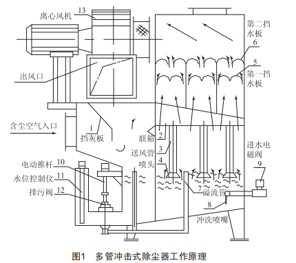 多管衝擊式除塵器是一種高效濕式除塵設備(bèi)。主要用於非纖維(wéi)、無腐蝕性、溫度(dù)不高(gāo)於120℃的含塵氣體的淨化處理。多管(guǎn)衝擊除塵(chén)器主要由10部分組成, ①進風口、②出風(fēng)口、③豎(shù)擋板、④斜擋板