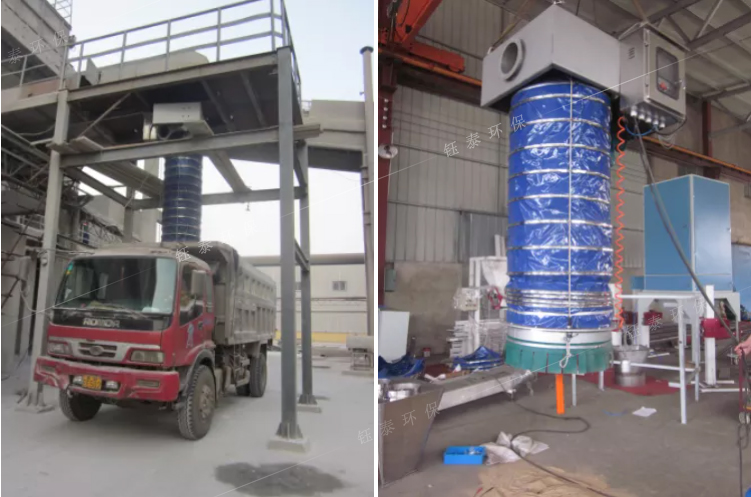 一(yī)鍵開啟自動裝車,粉塵無(wú)外溢是智能化無塵裝車伸縮溜筒的亮點,為了使無塵裝車伸縮溜筒具有除塵功能,關鍵是在溜筒出口處布置吸塵點。在除塵器離心風機的驅動下,在溜筒出口處的吸塵點