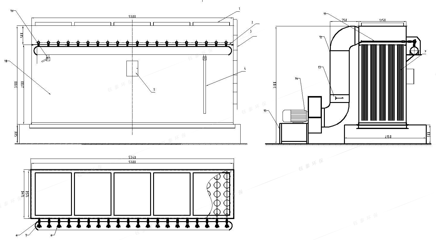 改造後,灰庫的(de)每單台庫頂布袋除塵器技術參數:處理風量17000m3/h、過濾(lǜ)風速1.0m/min、過濾麵積240m2,濾袋耐溫135℃、抽塵風機出口(kǒu)含塵濃度≤10mg/Nm3。除塵器外型尺寸為原除塵器外殼尺寸:5.3×1.25×3.1m(高)